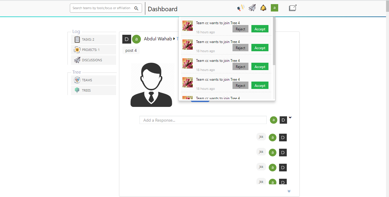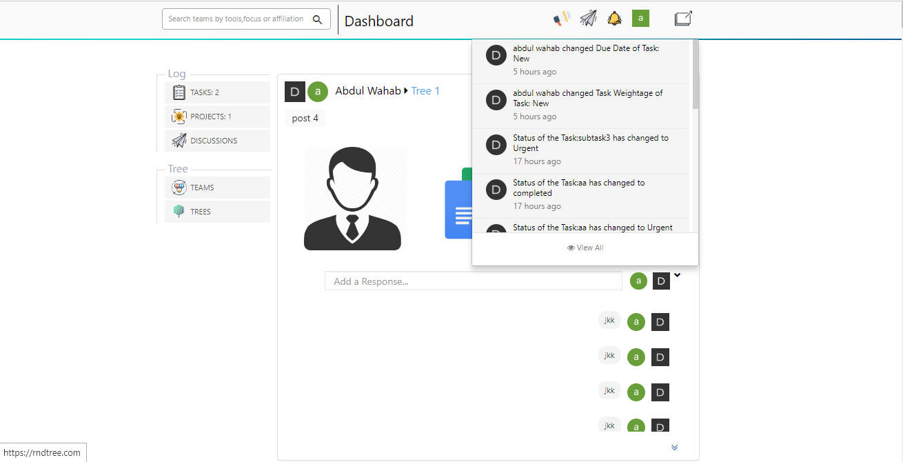 Rndtree is a team-based social networking platform designed to enable seamless collaboration on projects. The platform allows users to create Teams, Groups (Trees), Projects, Group Projects, and Tasks, facilitating an interactive and organized work environment.